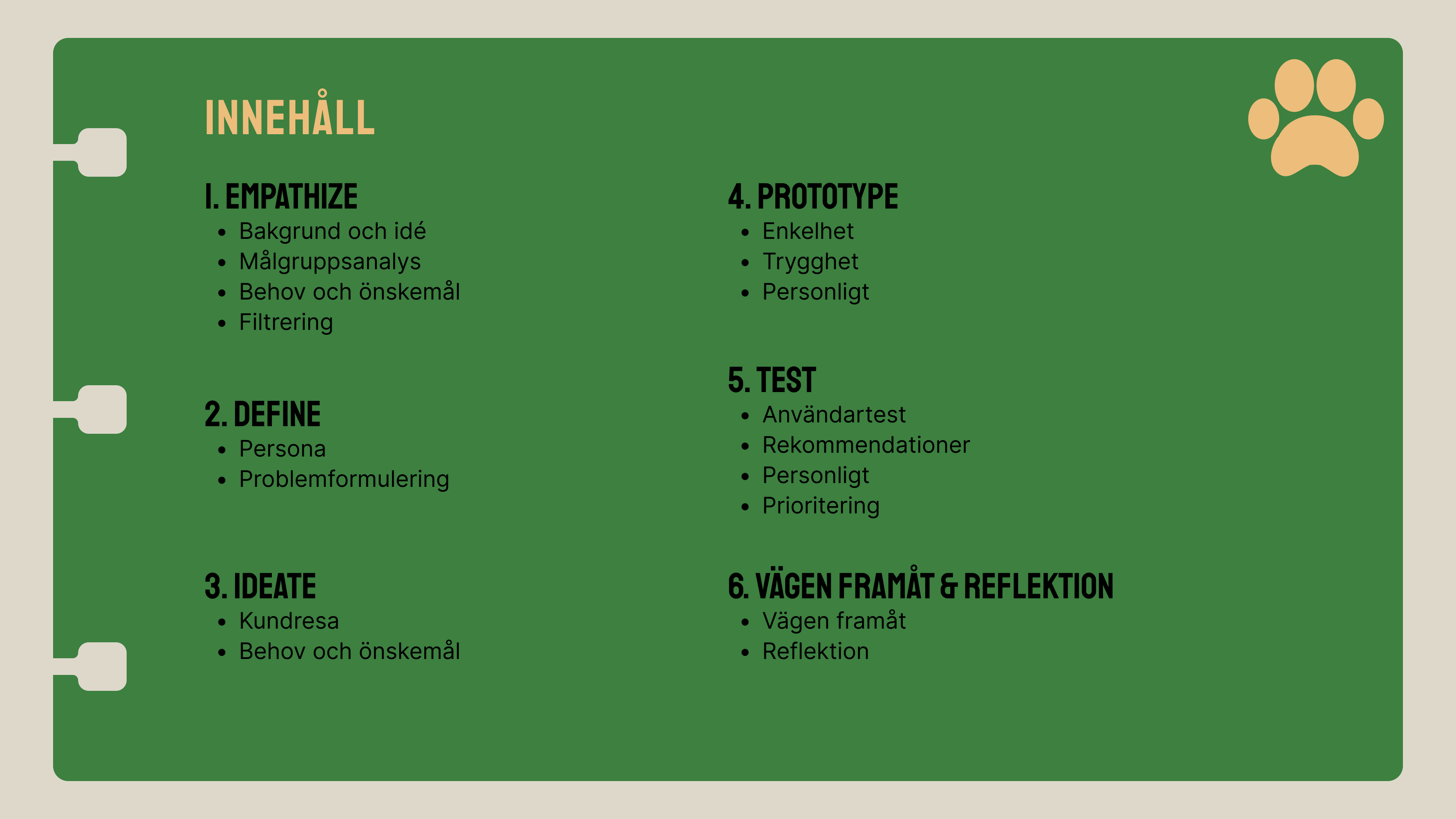 Intervjuerna var en del av kursupplägget, men metoden visade sig också vara särskilt lämplig då projektets fokus låg på att förstå hundägares situation, oro och beslutsfattande snarare än att validera färdiga lösningar.