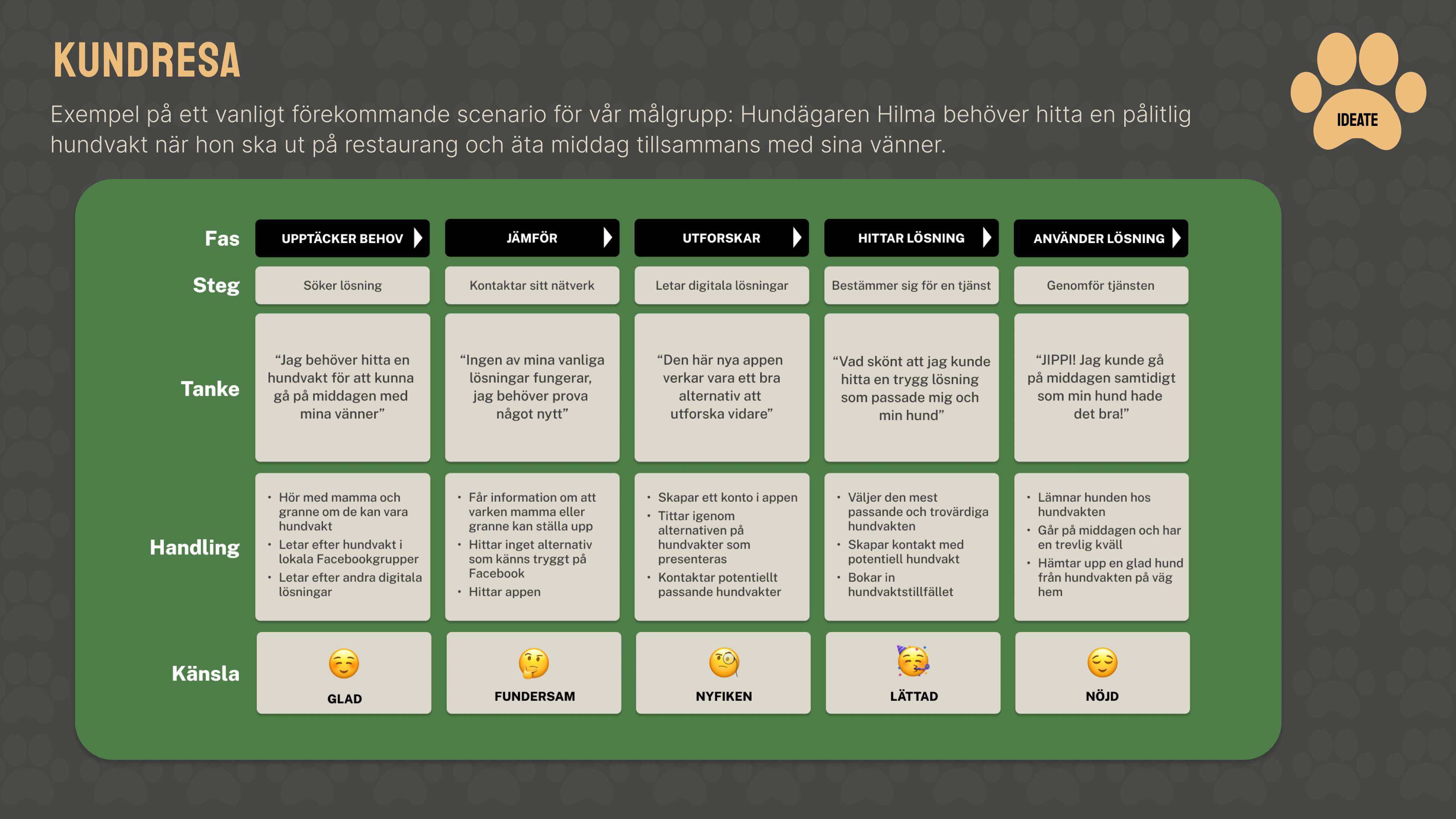 Detta projekt genomfördes inom ramen för en UX-designutbildning och fokuserade på att utforska hur trygg hundpassning kan designas som en digital tjänst, från research till testad prototyp.